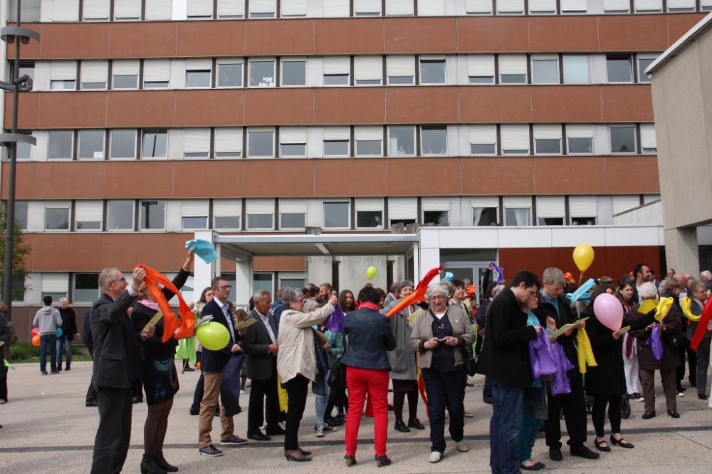 Le soleil n’était pas au rendez-vous de la météo, mais il l’était dans les coeurs qui ont pu célébrer Pâques avec des écharpes colorées, des cloches, des lapins, et un chant sur le parvis de l’Hôpital !