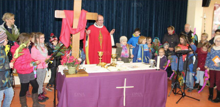Pendant ce temps, les plus petits avec leurs parents et leurs accompagnateurs ont poursuivi la procession derrière Toto guidé par son maître M. Gress à travers le village. Ils ont fait une halte pour décorer des rameaux qu’ils ont ensuite brandis durant la balade en acclamant « Hosanna, au plus haut des cieux » ! Peu avant l’eucharistie, les enfants ont rejoint l’assemblée pour prier le Notre Père.